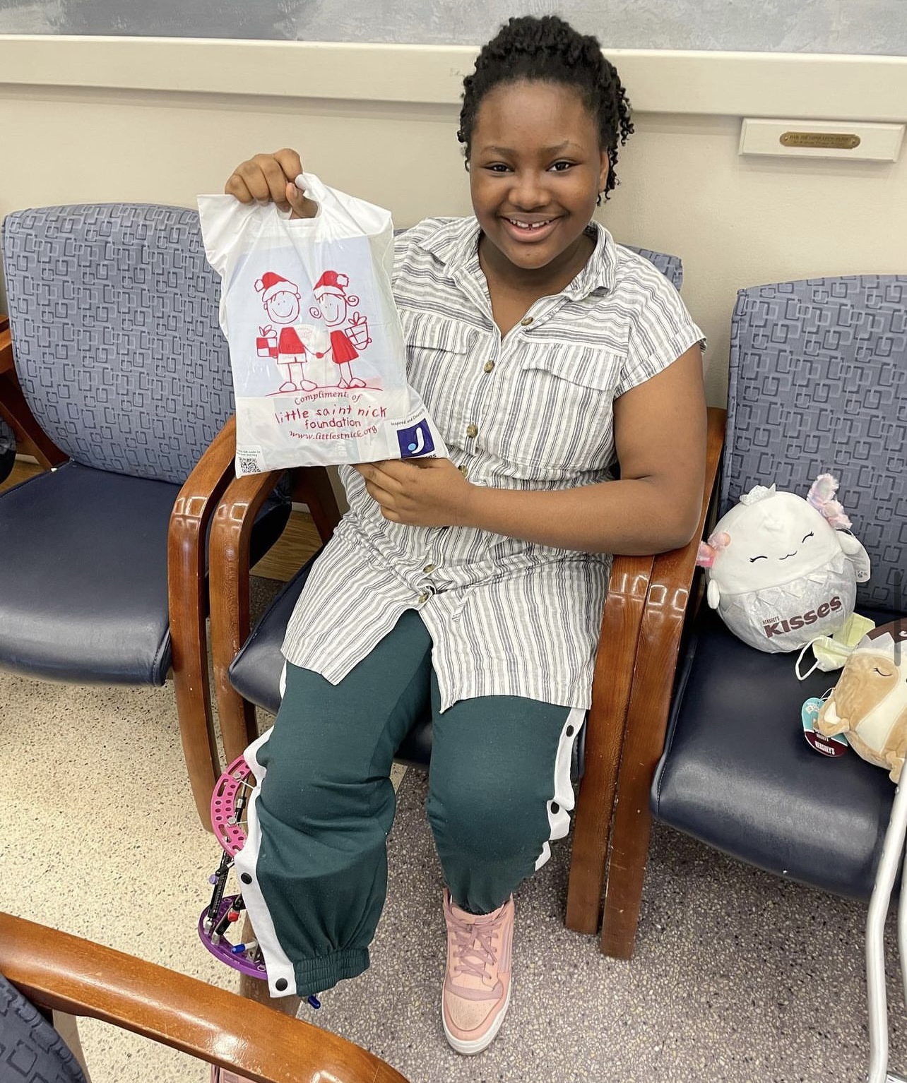 Displayed below is a photograph of Awesome, a Little Saint from Nigeria, who received a Gift Bag from St. Nick during our visit to Shriner's Philly. Awesome was thrilled to get our St. Nick Gift Bag.